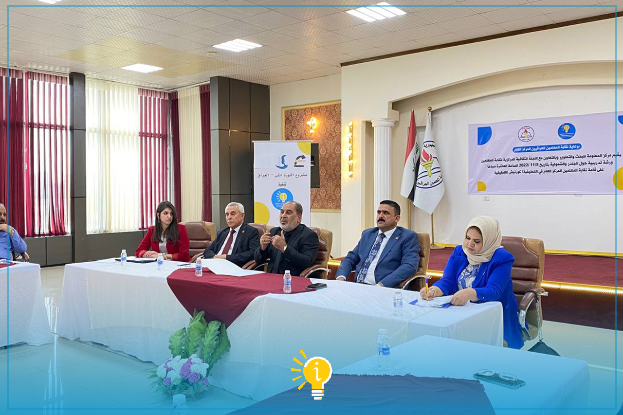 نظم المركز المعلومة للبحث والتطوير فريق هي ثورة بغداد ، بالتعاون مع اللجنة الثقافية المركزية لنقابة المعلمين ورشة تدريبية حول " الجندر والشمولية " والتي أقيمت يوم الثلاثاء الموافق 8 نوفمبر 2022 ، على قاعة نقابة المعلمين المركز العام في العطيفية ، وبحضور عدد من الكوادر التعليمية .